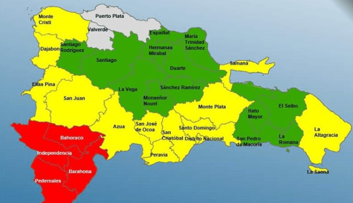 En alerta amarilla están: San José de Ocoa, Samaná, Dajabón, Azua, Monte Plata, Elías Piña, Peravia, La Altagracia, San Juan, Monte Cristi, Santo Domingo, San Cristóbal y el Distrito Nacional.