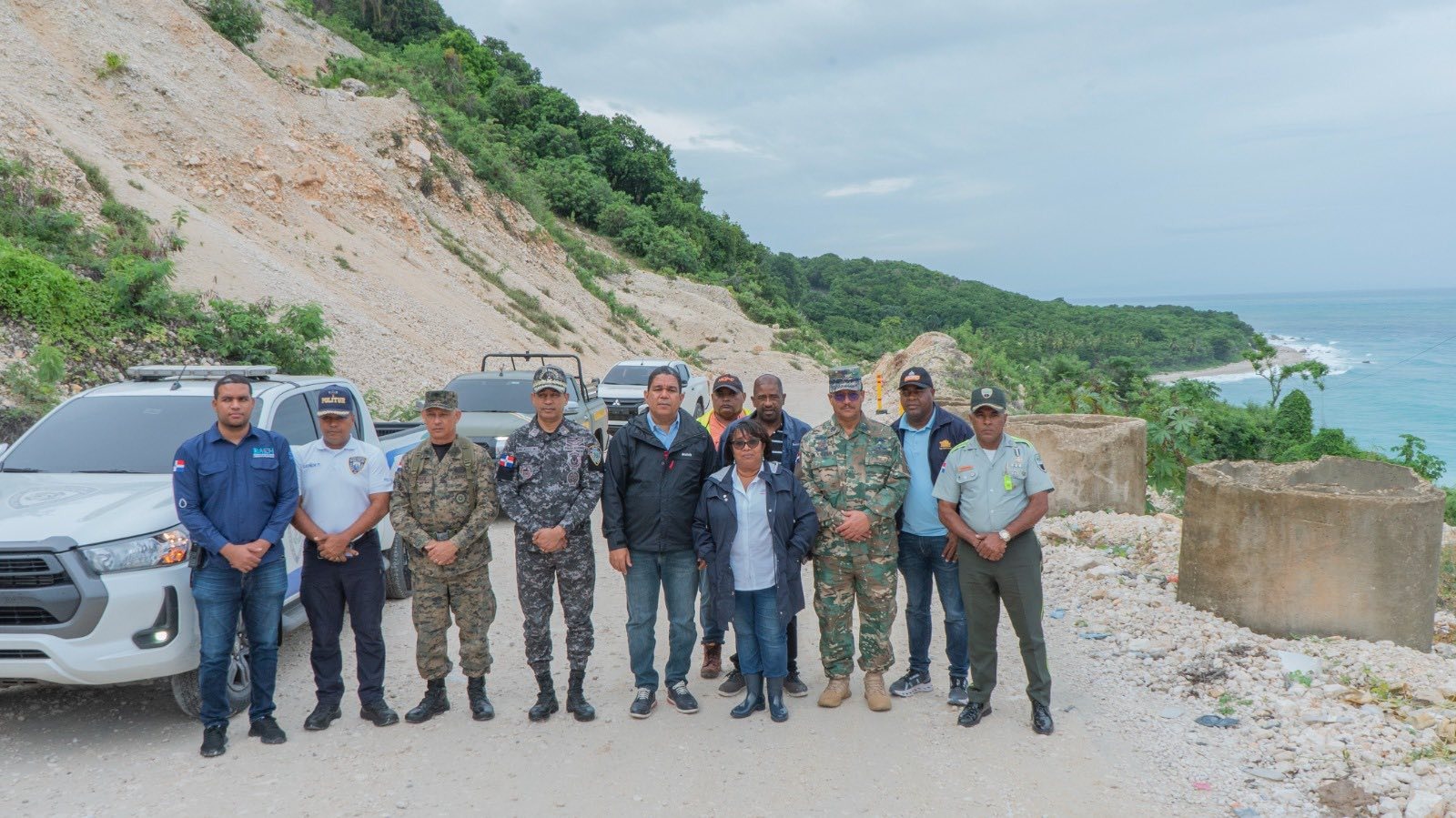 La representante del Poder Ejecutivo estuvo acompañada por el senador de la provincia, Dr. Moisés Ayala; miembros de la Policía Nacional; oficiales de la Fuerza Aérea de la República Dominicana; la Policía y el Ejército Nacional; representantes de la Defensa Civil, así como otros funcionarios públicos, quienes participaron en la verificación de las condiciones de las comunidades y en la planificación de acciones preventivas.