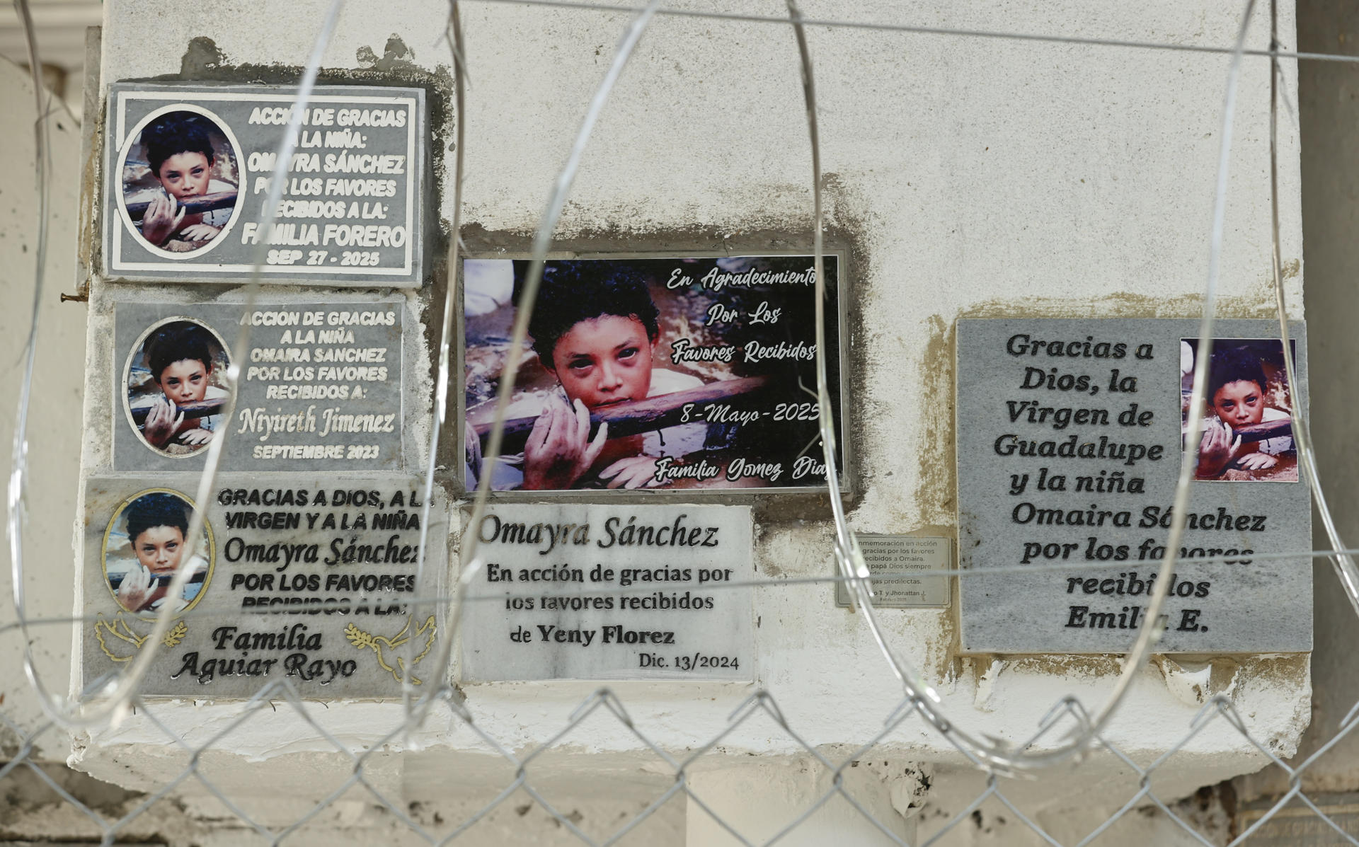 Fotografía del 5 de noviembre de 2025 que muestra lápidas con el imagen de Omaira en un altar, en Armero (Colombia). EFE/ Mauricio Dueñas Castañeda