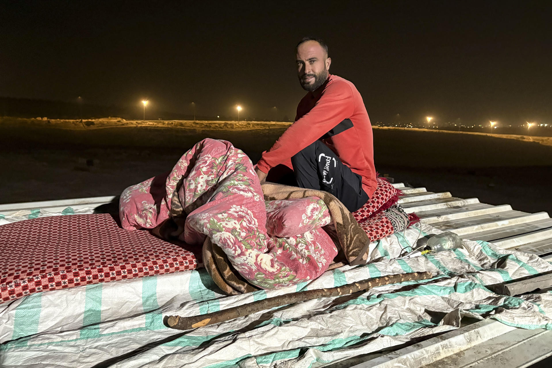 Saber Abu Aram, otro miembro de la familia, se acomoda en un colchón sobre el tejado, donde va a dormir. Desde allí arriba observa una panorámica de la zona, y apunta con una linterna cuando escucha algún ruido o si los perros ladran.