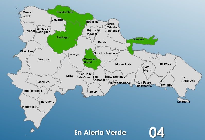 De acuerdo con el boletín del organismo, las provincias bajo alerta son Samaná, Santiago, Puerto Plata y Monseñor Nouel.
