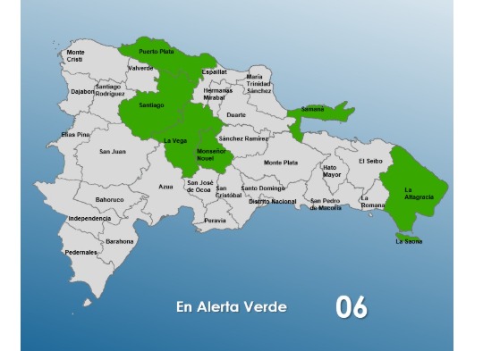 En ese sentido, las provincias ahora bajo alerta verde son Santiago, La Vega, Monseñor Nouel, Puerto Plata, La Altagracia y Samaná.