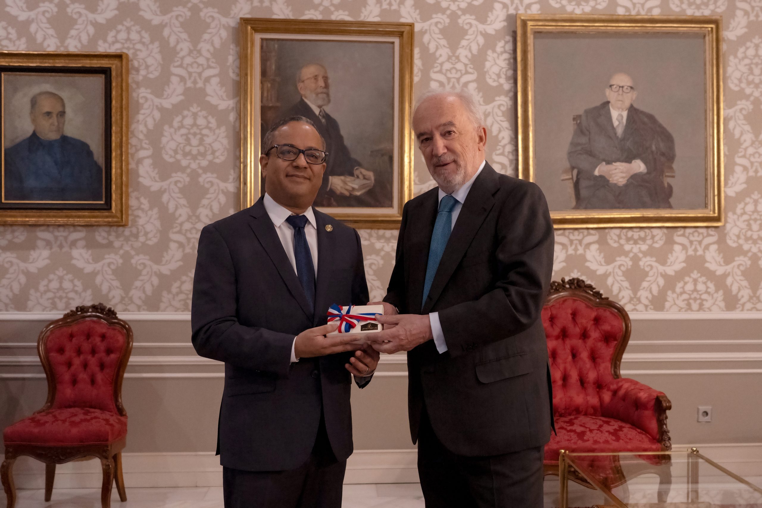 El magistrado Napoleón R. Estévez Lavandier, presidente del TC, y Santiago Muñoz Machado, director de la RAE, firmaron el convenio en la sede de esta institución académica cuyo objetivo es «velar por que la lengua española, en su continua adaptación a las necesidades de los hablantes, no quiebre su esencial unidad».