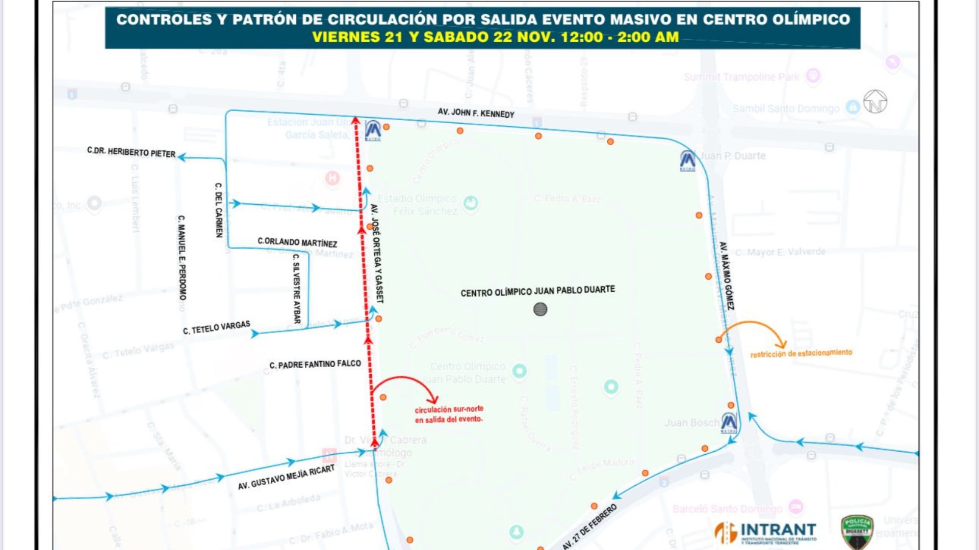 Así mismo, se indicó que se mantienen las restricciones de estacionamiento en las avenidas Máximo Gómez, 27 de Febrero, Kennedy y Ortega y Gasset, así como el acceso vehicular controlado al interior del Centro Olímpico.