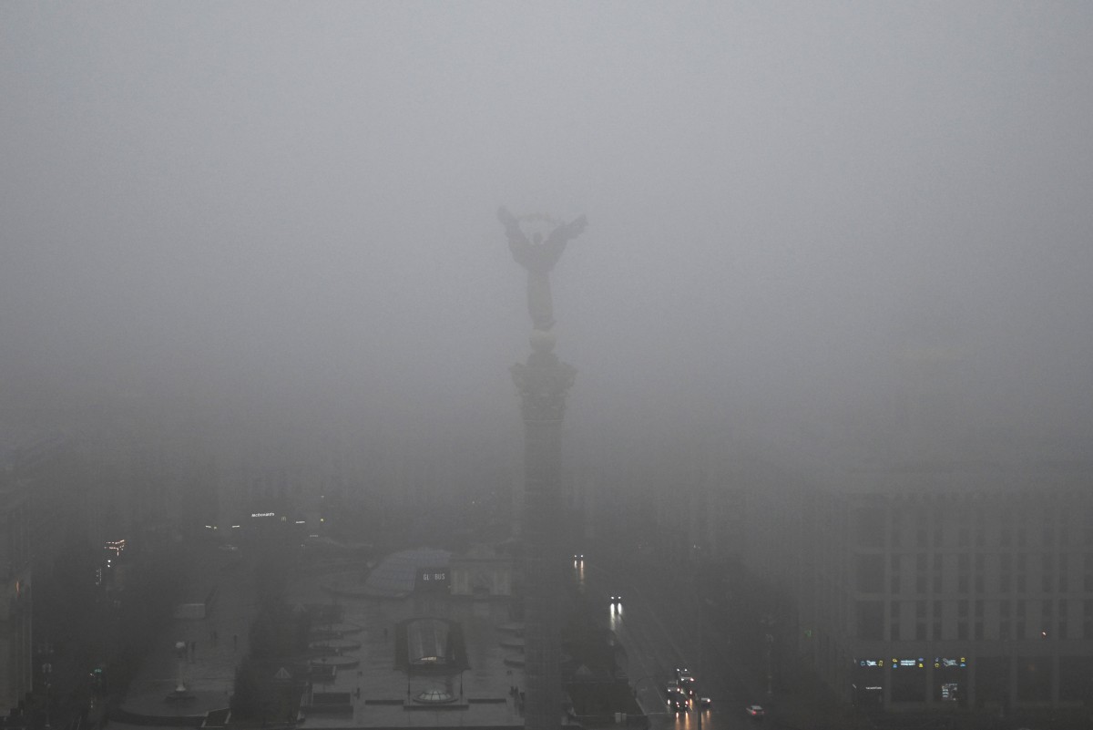 Vehículos circulan por la Plaza de la Independencia bajo una densa niebla, en Kiev, el 23 de noviembre de 2025, durante la invasión rusa de Ucrania. (Foto de Sergei GAPON / AFP)