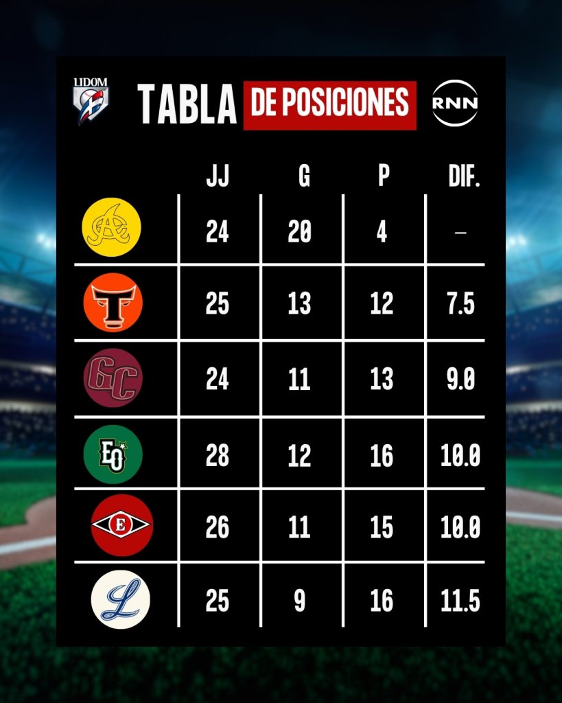 Las Águilas Cibaeñas siguen en la cima, dominando la tabla con 20 victorias y marcando el paso.