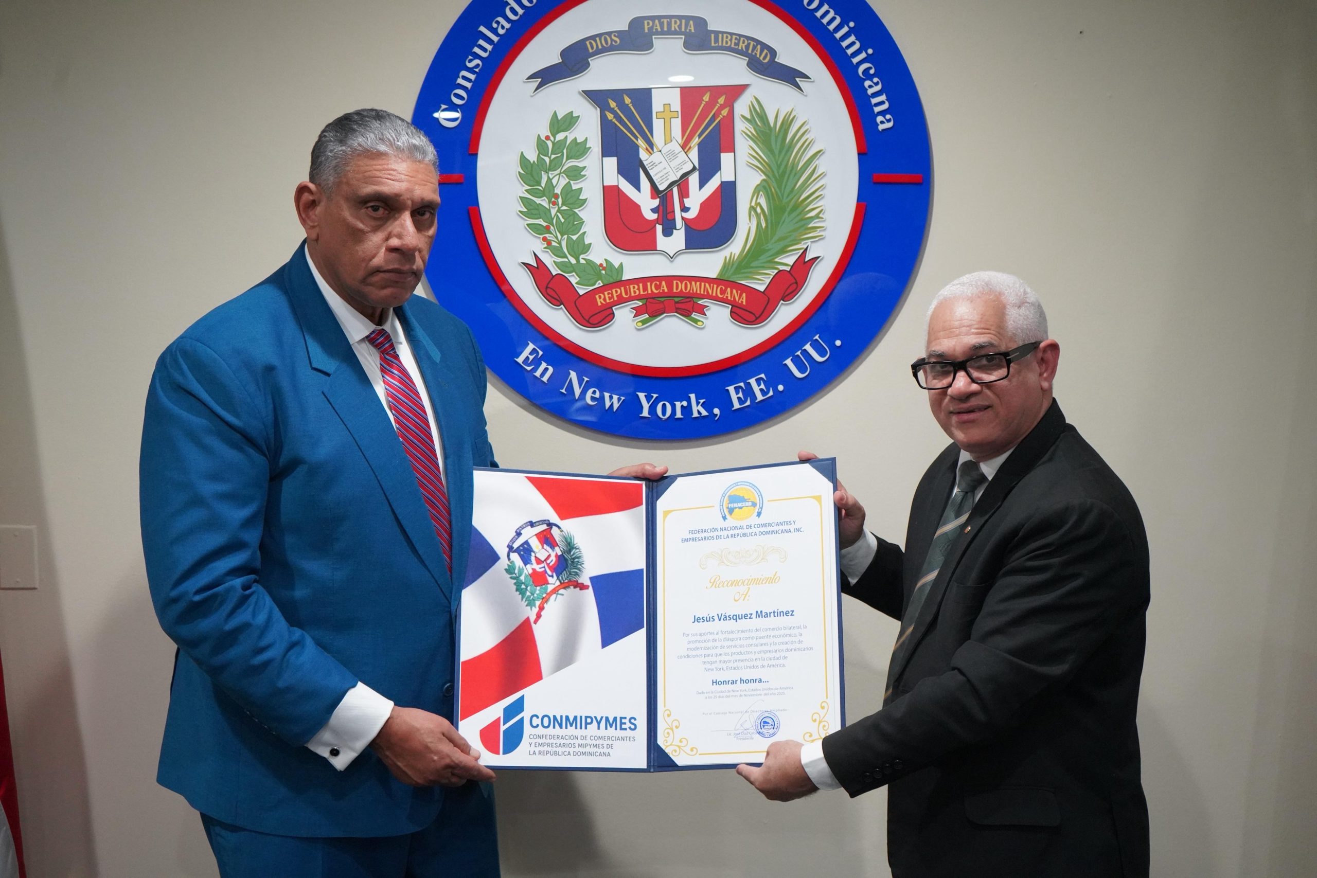 En la presea entregada por Díaz en la sede consular dominicana, localizada en el 1501 de Broadway, en Manhattan, los comerciantes y empresarios dominicanos expresan que Vásquez Martínez ha hecho grandes aportes al fortalecimiento del comercio bilateral, la promoción de la diáspora como fuente económica, la modernización de los servicios consulares y la creación de condiciones para que los productos y empresarios dominicanos tengan mayor presencia en la ciudad de Nueva York.