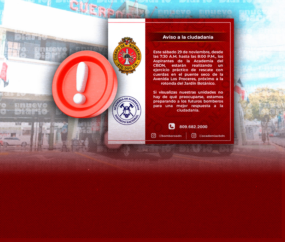 EL NUEVO DIARIO, SANTO DOMINGO.– El Cuerpo de Bomberos del Distrito Nacional (CBDN) informó que este sábado 29 de noviembre realizará un ejercicio práctico de rescate con cuerdas, en el puente seco de la avenida Los Próceres, próximo a la rotonda del Jardín Botánico.