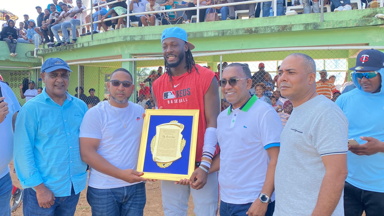 La entrega de la placa, realizada ante atletas, dirigentes y comunitarios, destacó la trayectoria del jugador de los Cincinnati Reds y el impacto que su ejemplo tiene en la juventud dominicana.