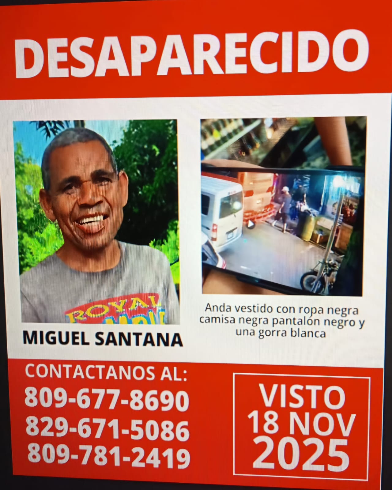 EL NUEVO DIARIO, SANTO DOMINGO.- Familiares del señor Miguel Santana, solicitan ayuda para dar con su paradero, visto por última vez el 18 de noviembre en la comunidad Los Cocos del Municipio San Antonio de Guerra, Santo Domingo Este, cuando salió a comprar unos medicamentos, sin comunicación hasta el momento.