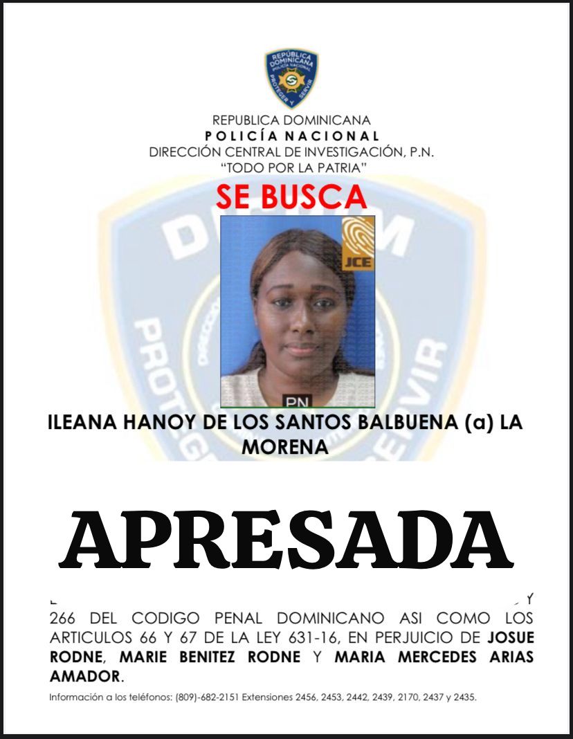 SANTO DOMINGO.- Ileana Hanoy de los Santos Balbuena, de 38 años, es la mujer que fue arrestada por el tiroteo que la semana pasada dejó a un niño de 10 años muerto, y a dos mujeres heridas, incluyendo a su madre en el sector Simónico, Villa Duarte, Santo Domingo Este.