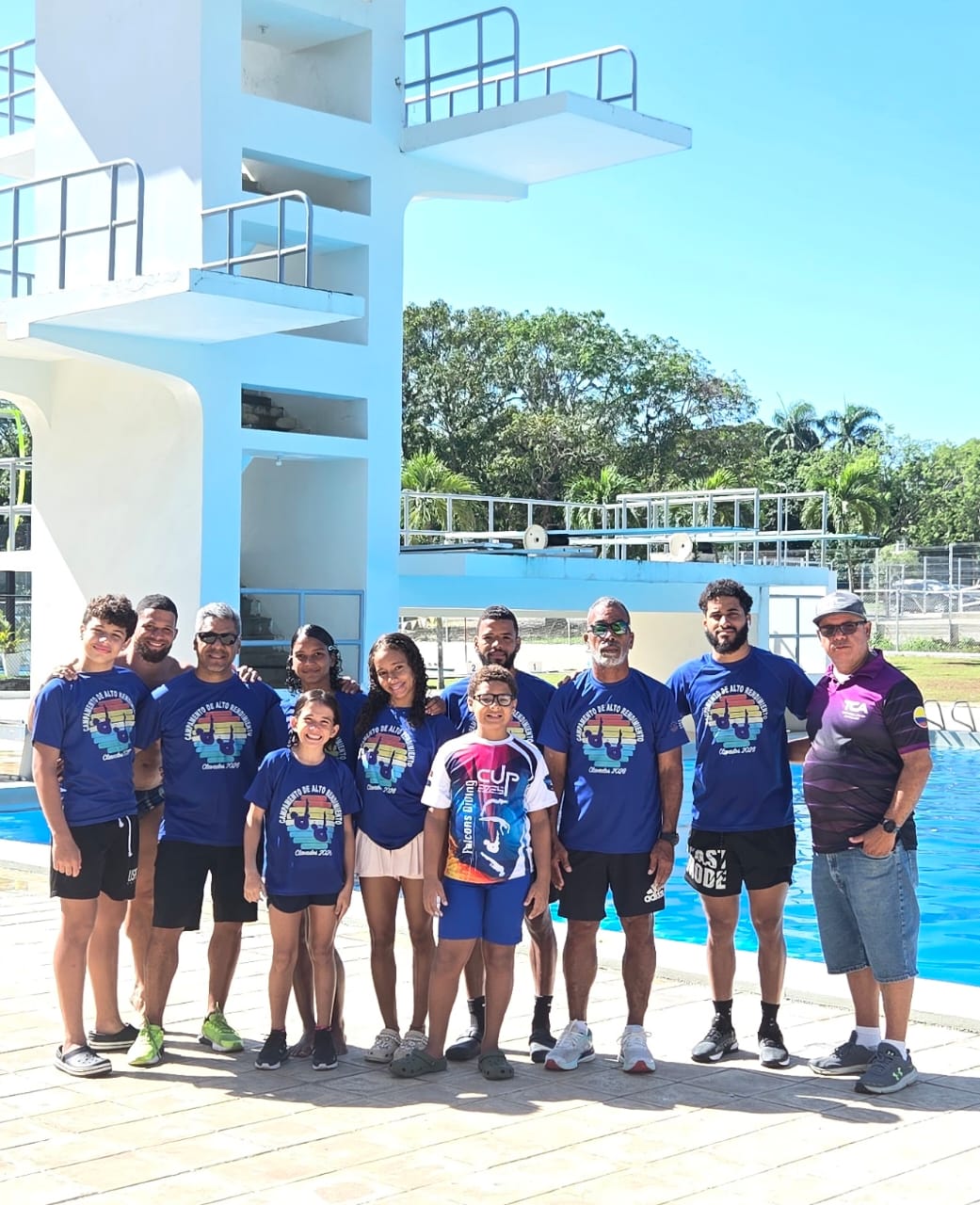 Desde la izquierda Erik Omar Ojeda, Frandiel Gómez, varios de los clavadistas, junto a Henry Reyes y Luis Boudet.