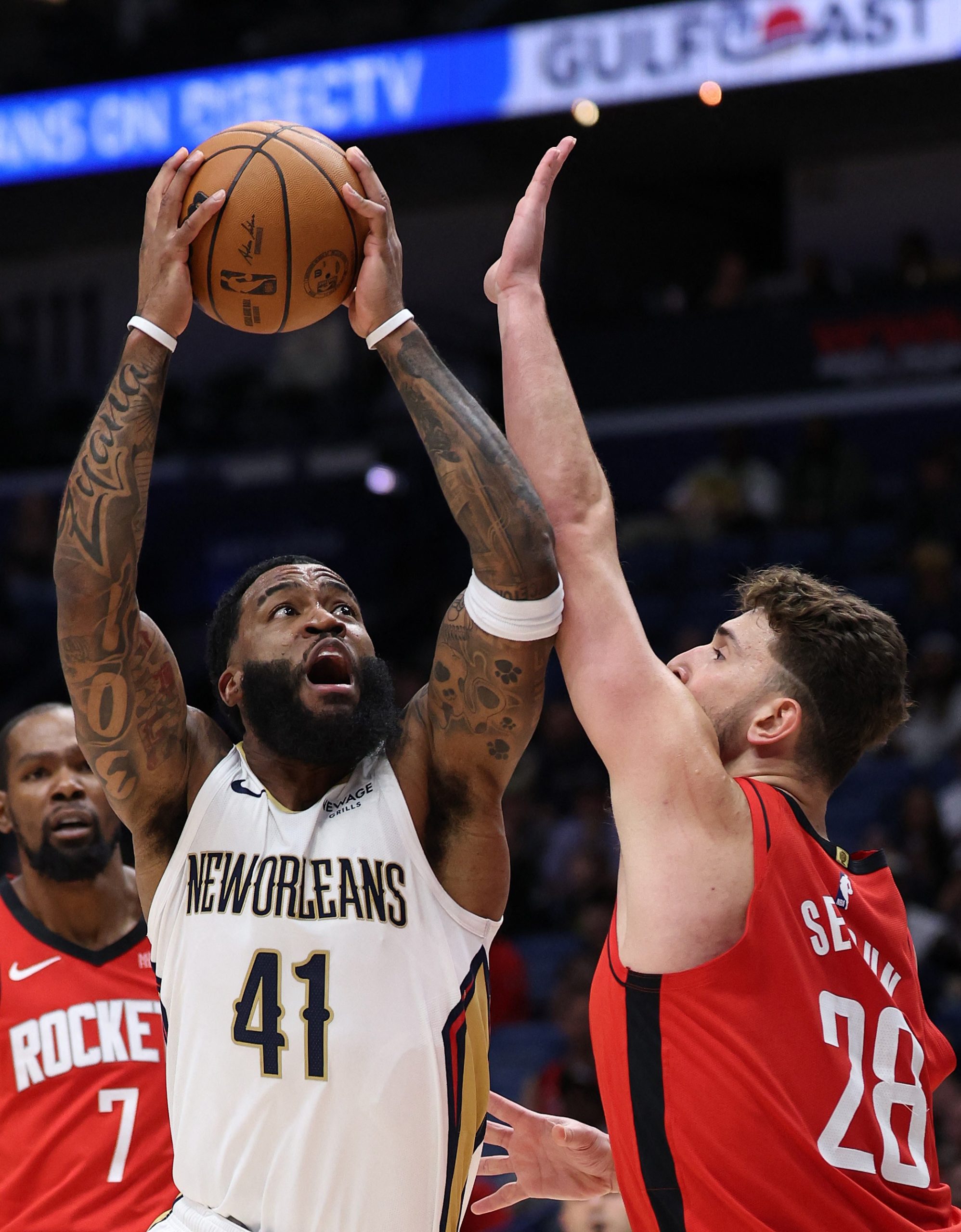 Saddiq Bey de los New Orleans Pelicans lanza el balón sobre Alperen Sengun de los Houston Rockets, Foto de Chris Graythen / GETTY IMAGES NORTH AMERICA / Getty Images vía AFP)
