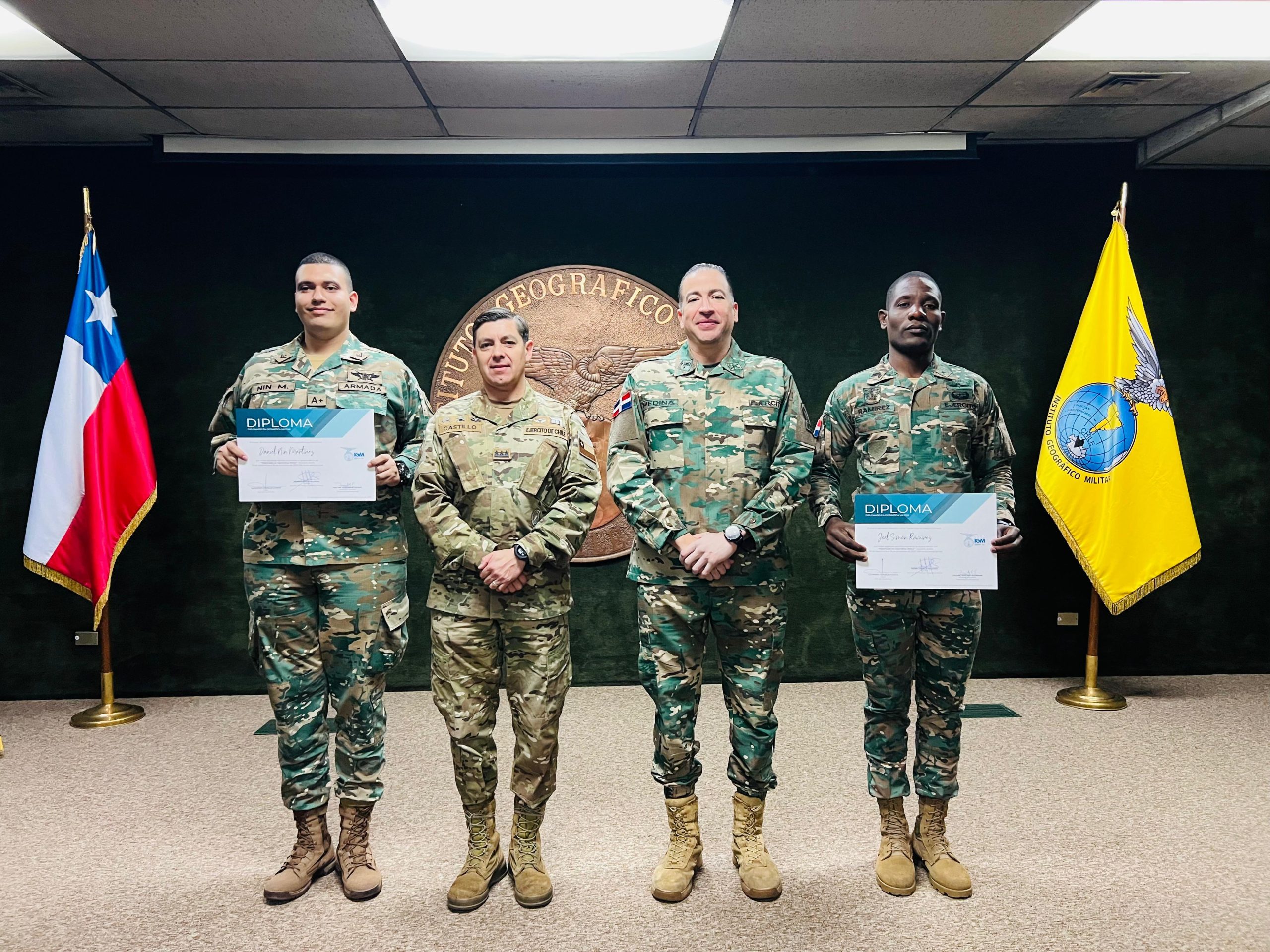 Posteriormente, el Director General del ICM participó en el acto de clausura de la tercera versión del Diplomado en Geomática Militar, impartido por el Instituto Geográfico Militar de Chile y celebrado en el auditorio central de la institución. En esta edición, por primera vez participaron estudiantes extranjeros: el sargento agrimensor Joel S. Ramírez, ERD, y el marinero especialista agrimensor Daniel J. Nin Martínez, ARD, quienes culminaron de manera exitosa el programa formativo, con una duración de cuatro meses.