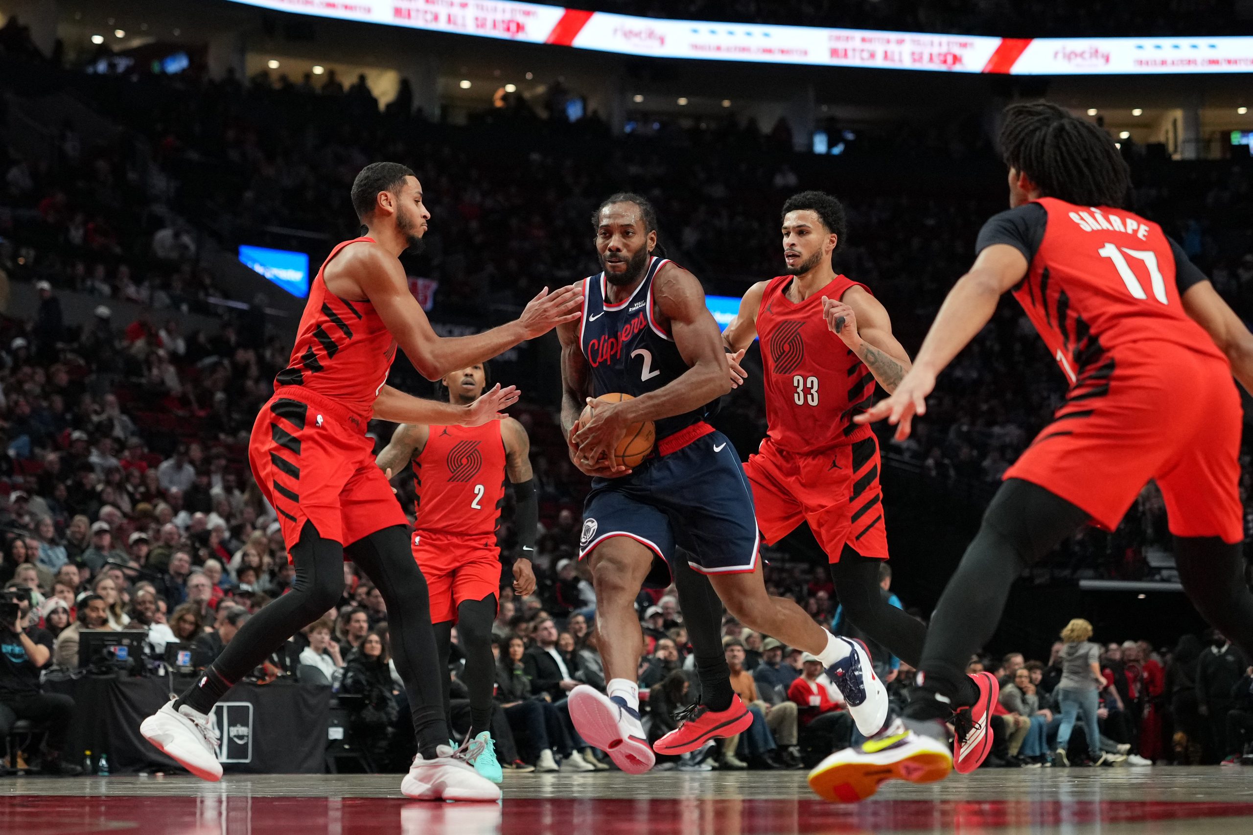 Kawhi Leonard de Los Angeles Clippers penetra hacia la canasta contra Rayan Rupert (izq.) de los Portland Trail Blazers. (Foto de Soobum Im / GETTY IMAGES NORTH AMERICA / Getty Images vía AFP)