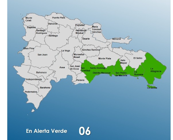 Las provincias bajo alerta verde son San Cristóbal, Santo Domingo, San Pedro de Macorís, La Romana, La Altagracia, además del Distrito Nacional para un total de seis demarcaciones.