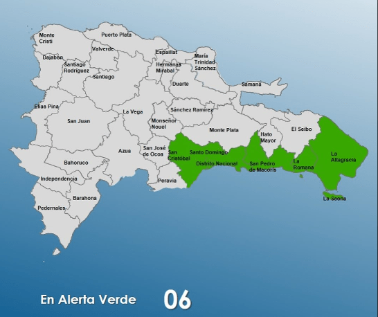Las provincias en alerta verde son San Cristóbal, San Pedro de Macorís, La Romana, Santo Domingo, Distrito Nacional y La Altagracia.