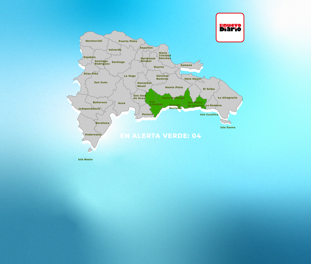 Las provincias y demarcaciones para las cuales fue levantada la alerta verde son San Cristóbal, San Pedro de Macorís, Distrito Nacional y Santo Domingo.