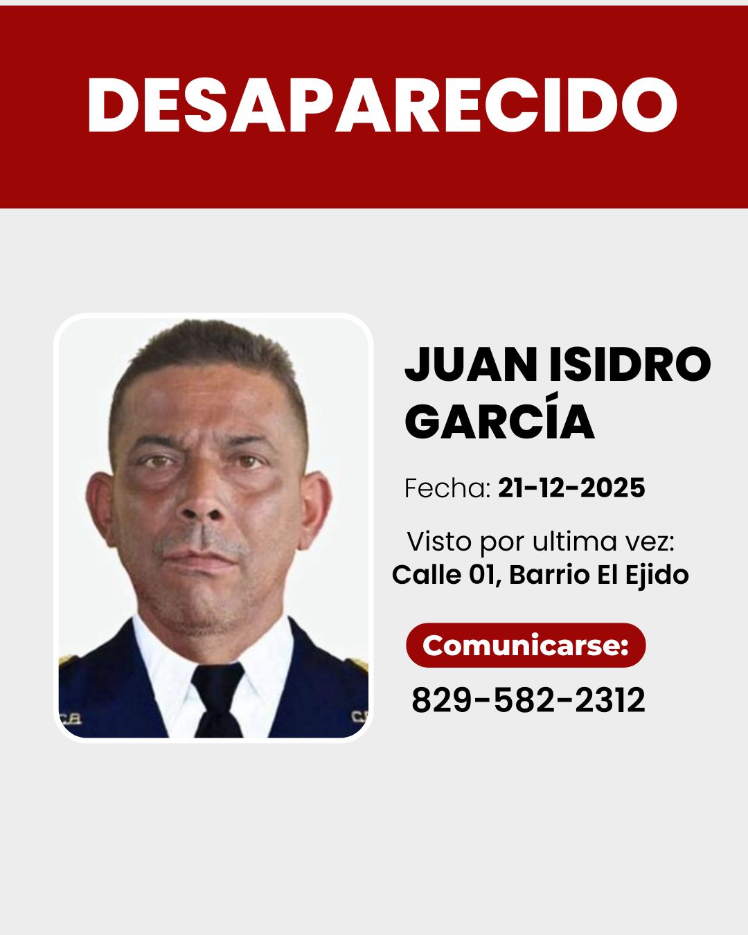 Santo Domingo. -El Cuerpo de Bomberos de Santiago informó este viernes que el capitán Juan Isidro García permanece desaparecido desde el pasado 21 de diciembre de 2025, fecha en la que salió de su residencia para acudir a un chequeo médico rutinario en un centro de salud de la ciudad.