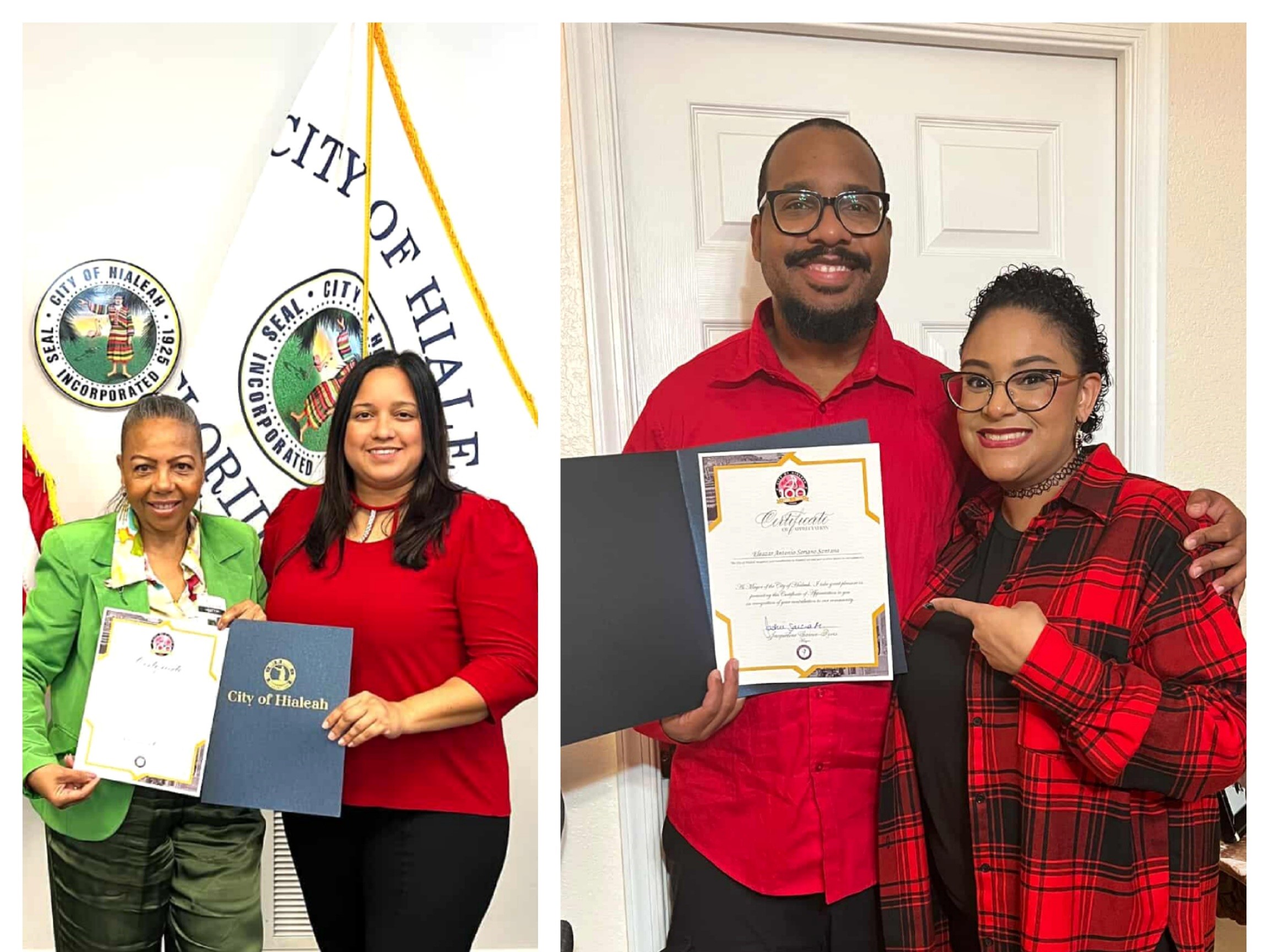 En la gráfica la madre del artista, la periodista Rose Mary Santana tras recibir de la jefa del Despacho de la Alcaldía de Hialeah el Certificado y luego el destacado creador y artista, Eleazar Soriano Santana adjunto a su compañera Jessica Rodríguez, muestran orgullosos y agradecidos el reconocimiento.