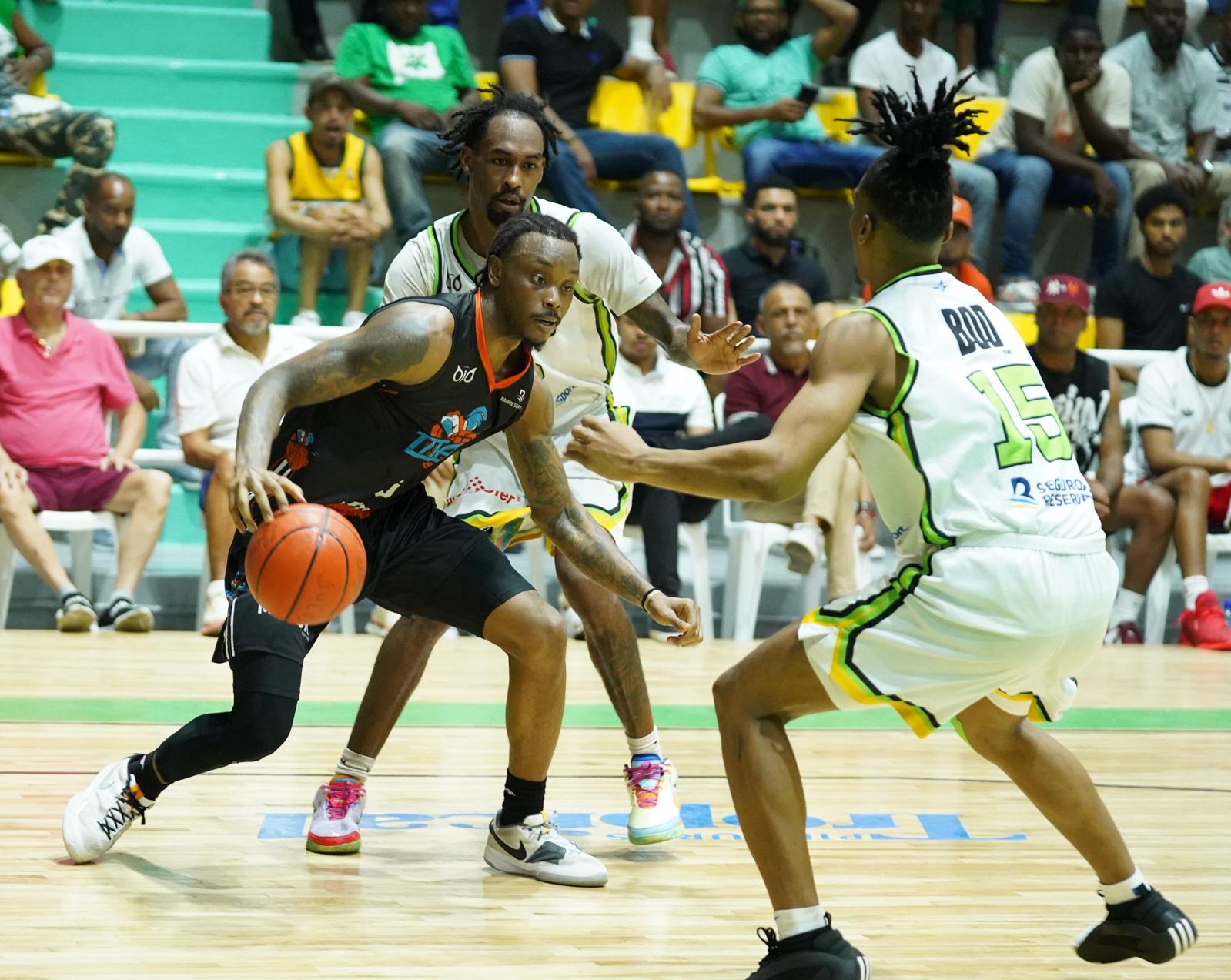 Mustapha Heron, de los Titanes del Sur, driblea el balón entre los jugadores de Soles del Este, Tristan Jarrett y Luis Martínez. Foto archivo.