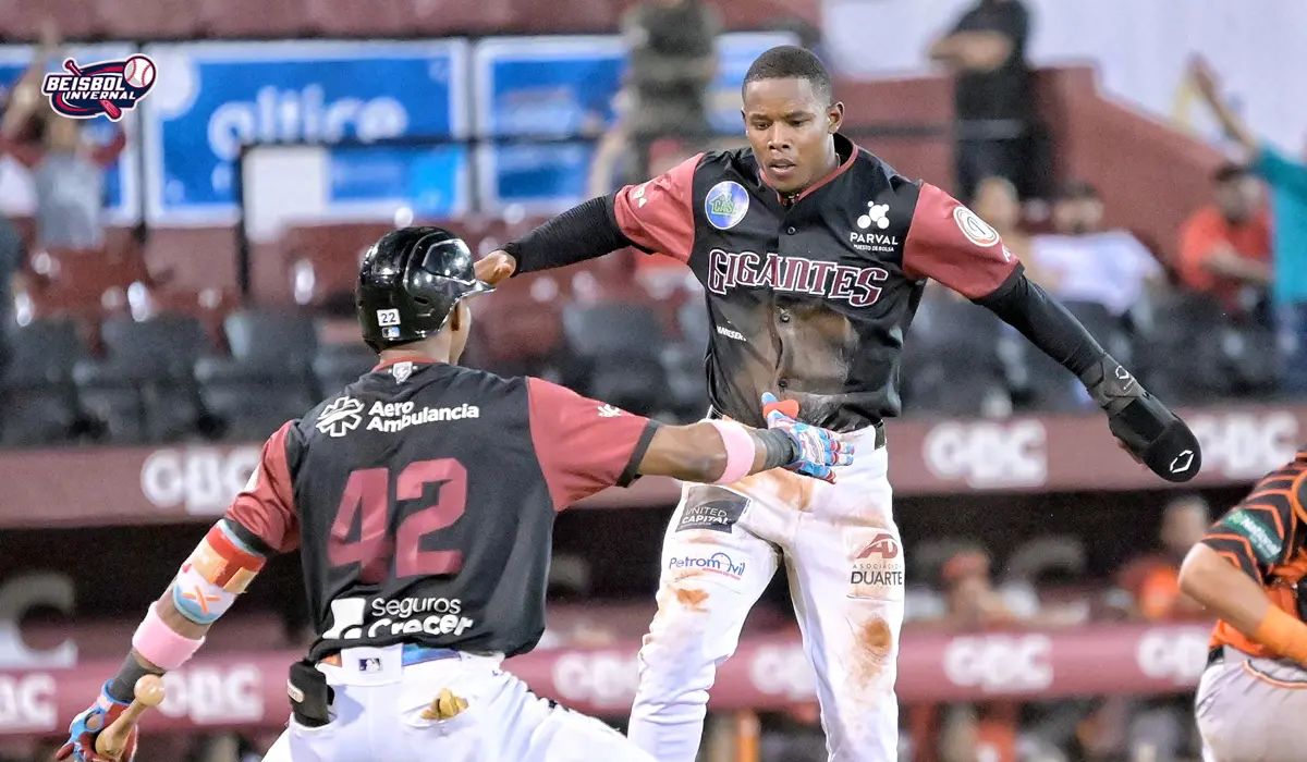 Eddinson Paulino celebra al anotar una carrera para los Gigantes del Cibao.