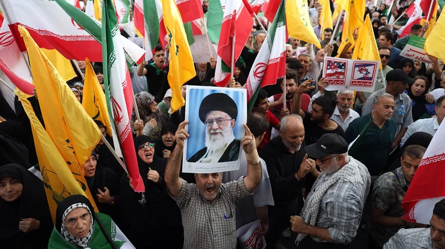 Un iraní sostiene un retrato del líder supremo iraní, el ayatolá Alí Jamenei, entre banderas nacionales de Irán durante una manifestación en Teherán tras el alto el fuego con Israel. EFE/Abedin Taherkenareh.-