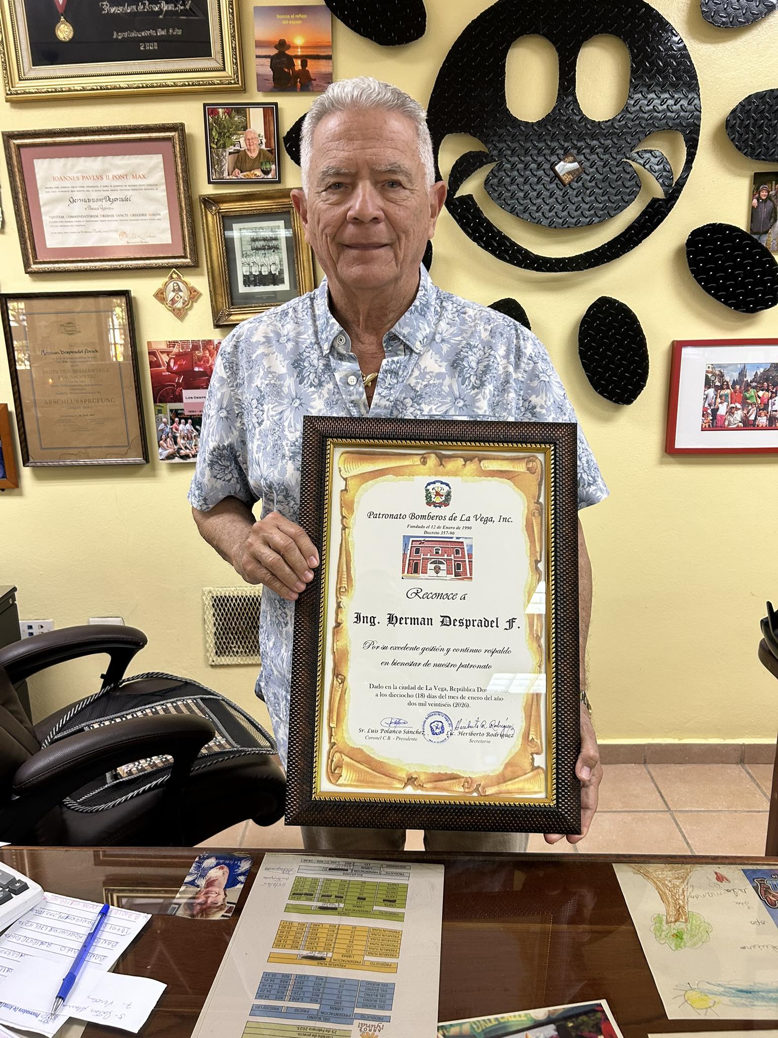 EL NUEVO DIARIO, SANTO DOMINGO.-El Patronato de los Bomberos de la ciudad de La Vega, provincia del mismo nombre, otorgó un pergamino de reconocimiento al ingeniero German (Manito) Despradel “por su excelente gestión y continuo respaldo” a favor de la referida institución.