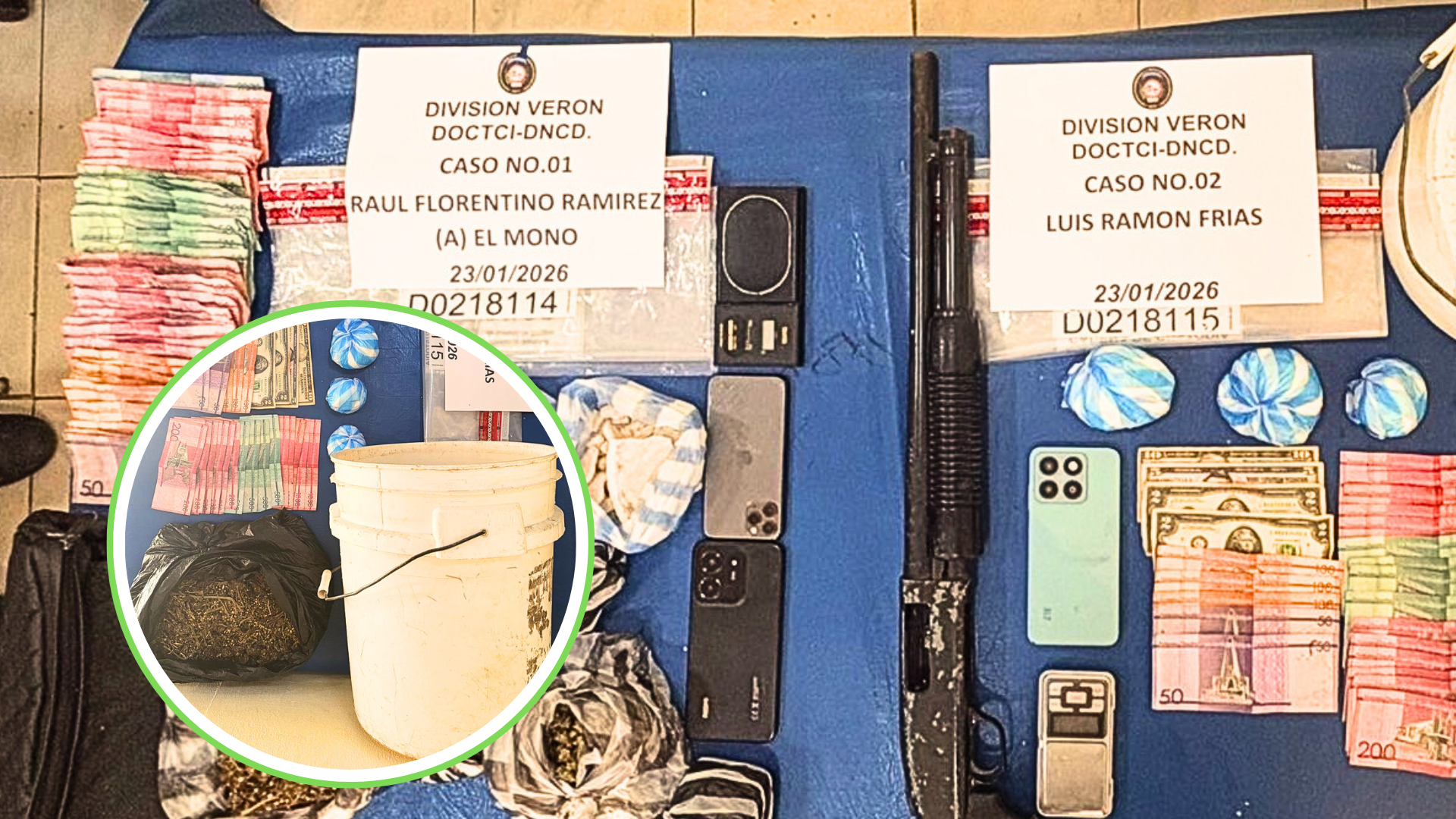 También se incautaron dos balanzas, tres celulares, una escopeta calibre 12, con numeración limada, varios cartuchos, RD$24,450 pesos dominicanos, US$19 dólares estadounidenses, una cubeta, entre otras evidencias.