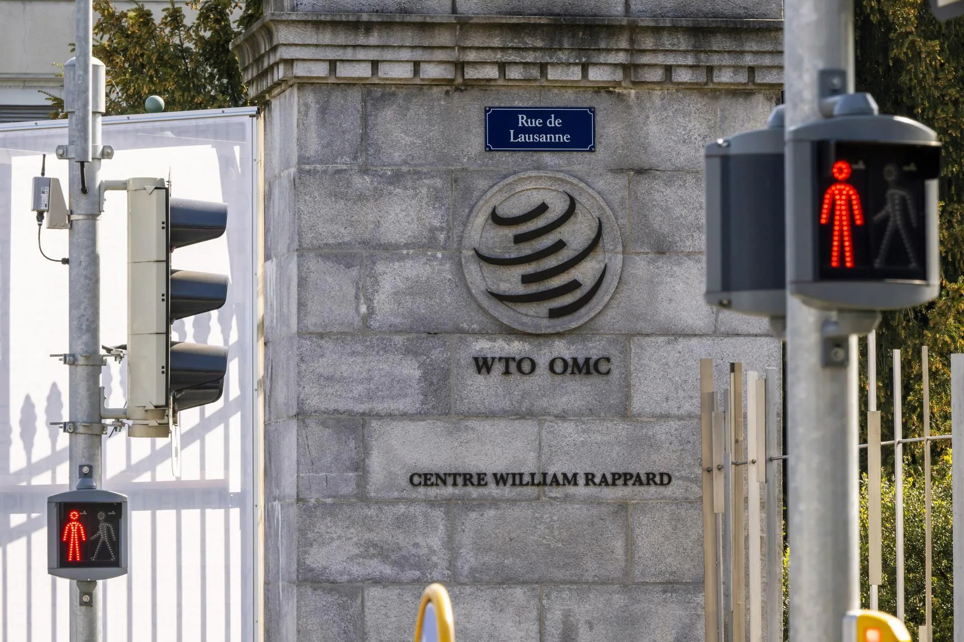 Un semáforo junto a la entrada de la sede de la Organización Mundial del Comercio (OMC) en Ginebra, Suiza, en una imagen de archivo. EFE/MARTIAL TREZZINI