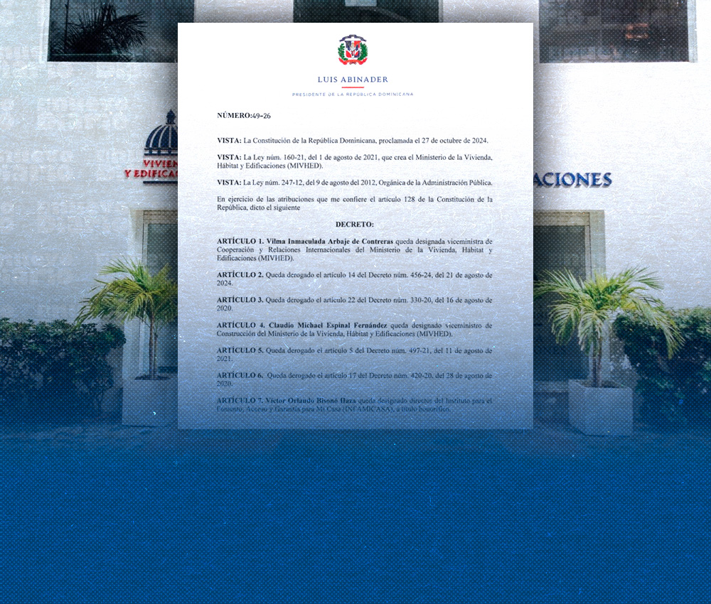 EL NUEVO DIARIO, SANTO DOMINGO. – El presidente de la República, Luis Abinader emitió el Decreto núm. 49-26, mediante el cual realizó nuevas designaciones y derogaciones en el Ministerio de la Vivienda, Hábitat y Edificaciones (Mived), en ejercicio de las atribuciones que le confiere el artículo 128 de la Constitución.