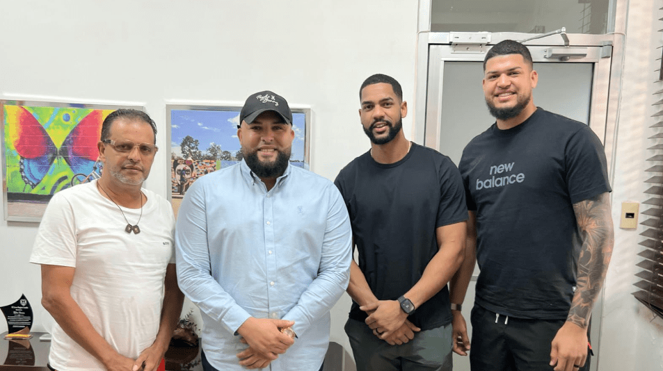 De izquierda a derecha: Carlos Alberto Antigua, director de Deportes Alcaldía Tenares, el alcalde Kelvin Herrera, Leody Taveras de los Orioles de Baltimore y Steven Cruz de los Reales de Kansas City