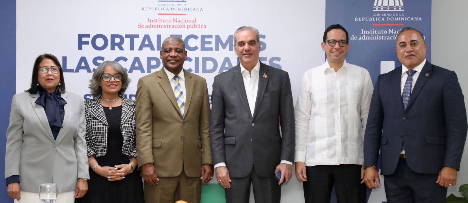 Al centro el presidente Luis Abinader y director del INAP Gregorio Montero junto a otros funcionarios. (Foto: INAP).