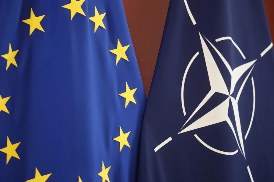Banderas de la Unión Europea y de la OTAN en una imagen de archivo. EFE//TOMS KALNINS