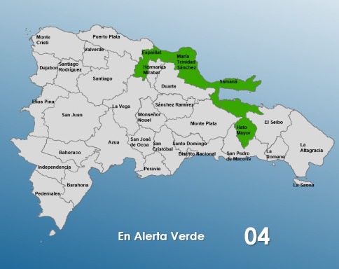 En virtud de esta situación, el COE declaró alerta verde para las provincias Espaillat, María Trinidad Sánchez, Samaná y Hato Mayor como medida preventiva ante posibles crecidas de ríos, arroyos y cañadas, así como inundaciones repentinas o urbanas. Por otro lado, se discontinuó la alerta verde en las provincias Hermanas Mirabal y Duarte. La alerta verde se declara cuando las condiciones permiten prever la ocurrencia de un fenómeno que podría representar un peligro para la población, ya sea de manera parcial o total.
