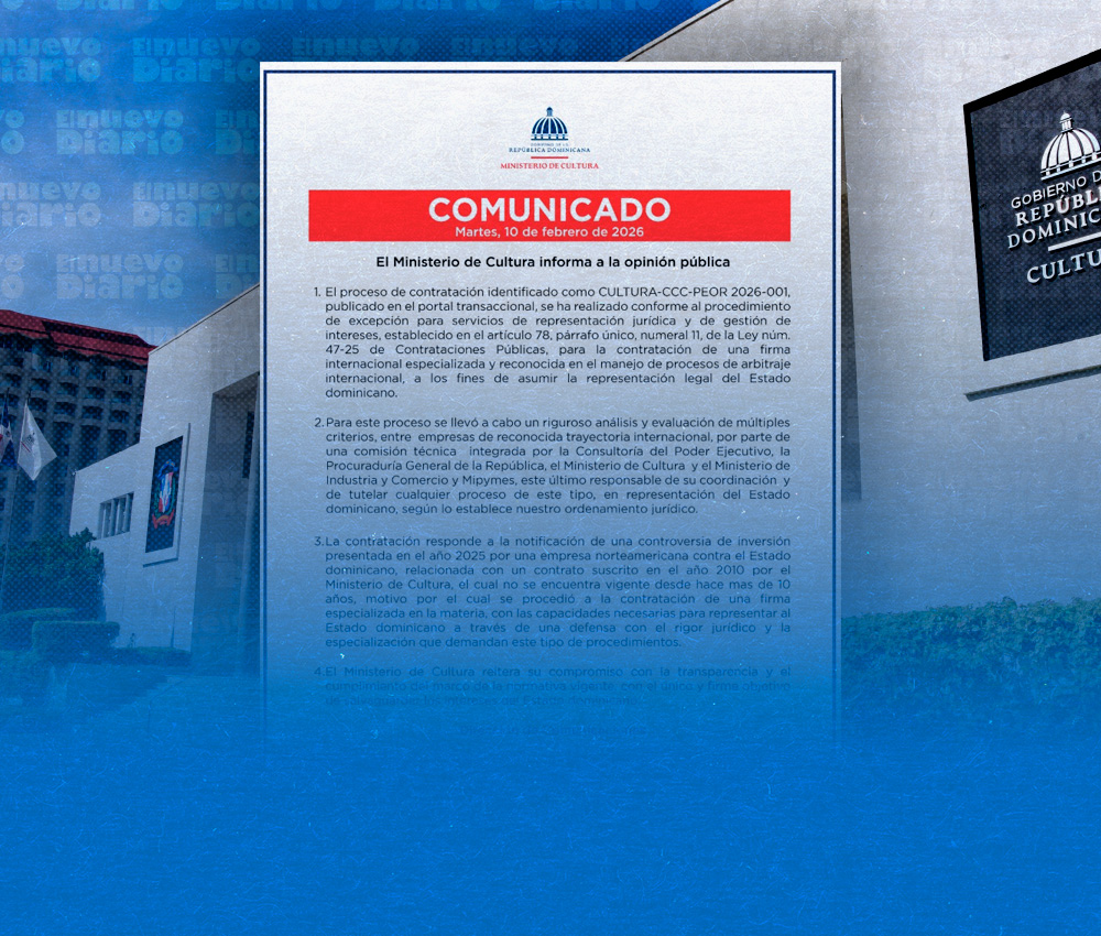 EL NUEVO DIARIO, SANTO DOMINGO.– El Ministerio de Cultura confirmó este martes la contratación de una firma internacional especializada en arbitraje de inversión, para asumir la representación legal del Estado dominicano ante una controversia de inversión notificada en el año 2025 por una empresa norteamericana.