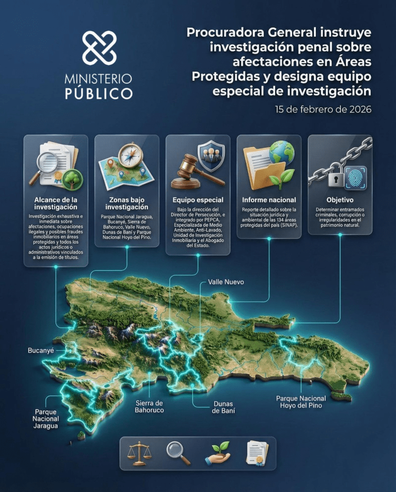 La investigación abarcará el Parque Nacional Jaragua, Bucanyé, Sierra de Bahoruco, Valle Nuevo, las Dunas de Baní y el Parque Nacional Hoyo del Pino, donde se ordenó revisar todos los actos jurídicos y administrativos que hayan derivado en la emisión de títulos de propiedad.