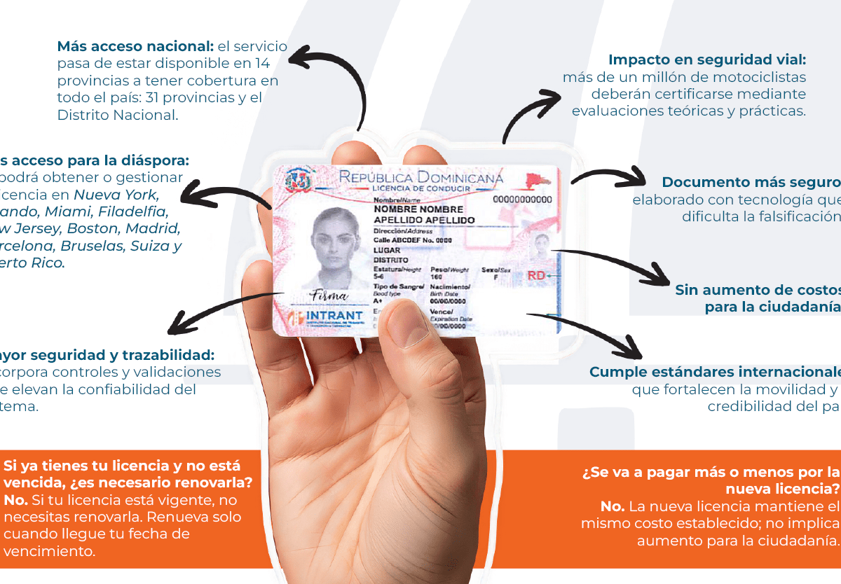 Entre los principales cambios, se destaca la ampliación del servicio, que pasa de estar disponible en 14 provincias a tener cobertura en todo el territorio nacional, incluyendo las 31 provincias y el Distrito Nacional. Asimismo, se amplía el acceso para la diáspora dominicana, permitiendo gestionar la licencia en ciudades como Nueva York, Miami, Orlando, Filadelfia, Nueva Jersey, Boston, Madrid, Barcelona, Bruselas, Suiza y Puerto Rico.