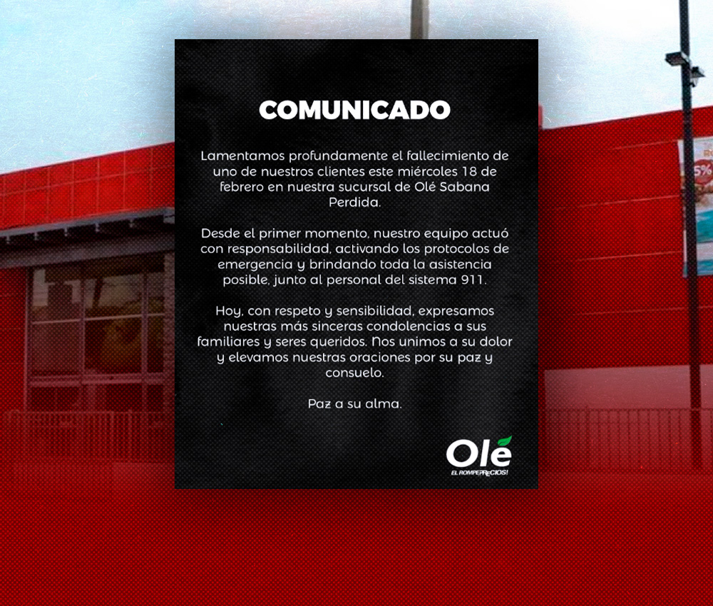 EL NUEVO DIARIO, SANTO DOMINGO NORTE. – La cadena de supermercados Olé informó este miércoles el fallecimiento de uno de sus clientes mientras se encontraba en la sucursal ubicada en Sabana Perdida.