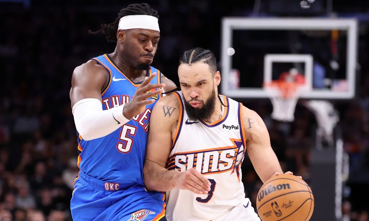 Dillon Brooks, de los Suns, maneja el balón, ante la defensa del Thunder de Oklahoma. NBA.com