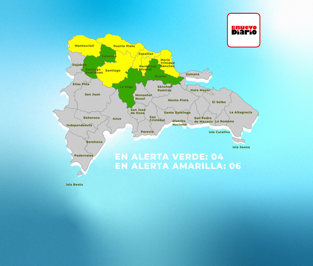 En alerta amarilla están Espaillat, Santiago, María Trinidad Sánchez, Puerto Plata, Hermanas Mirabal y Monte Cristi. Mientras que en alerta verde se encuentran Santiago Rodríguez, Valverde, Duarte y La Vega.