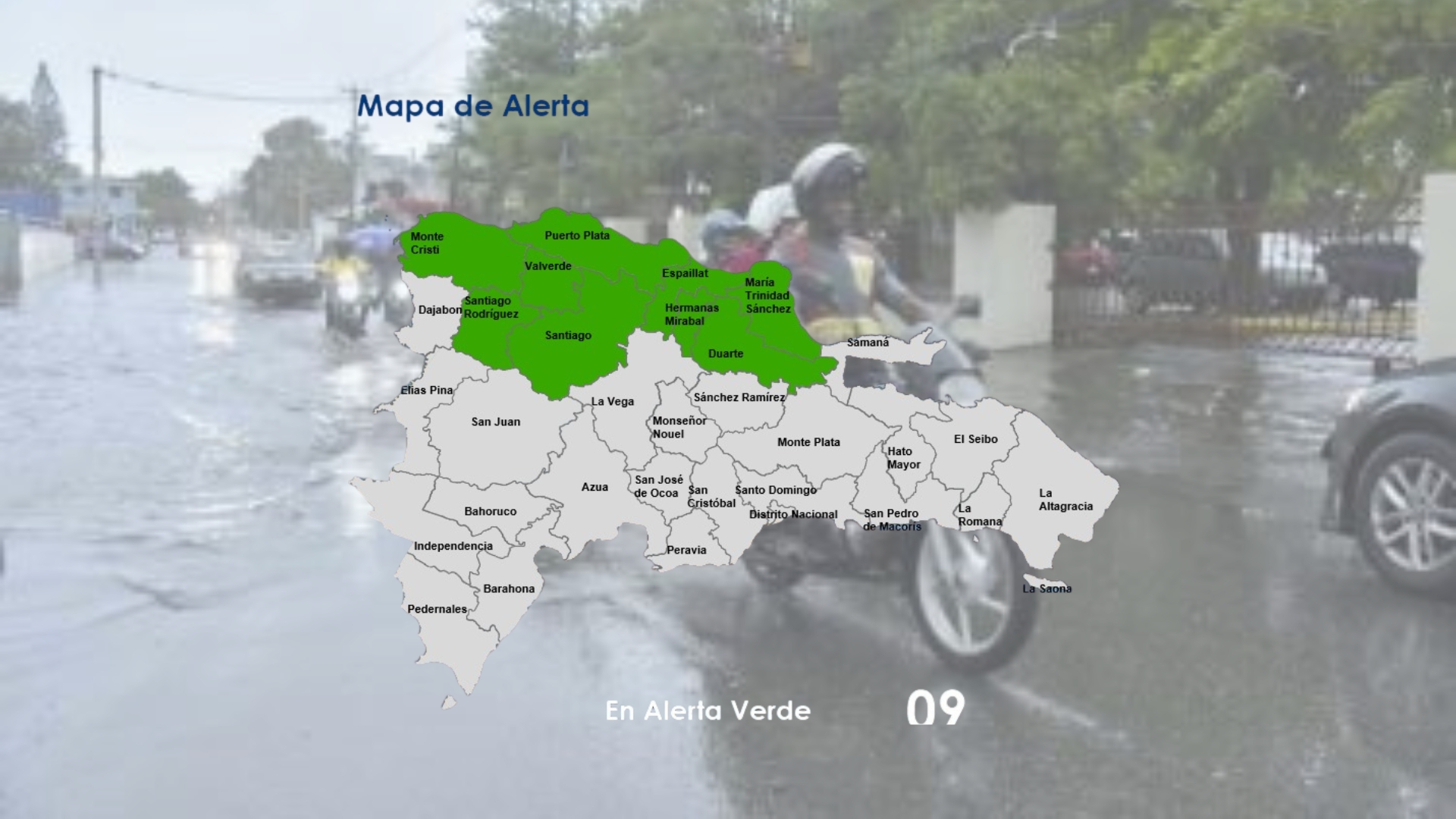 Las provincias que fueron colocadas en alerta verde son: Espaillat, Monte Cristi, Hermanas Mirabal, María Trinidad Sánchez, Puerto Plata, Valverde, Santiago Rodríguez, Santiago, Duarte.