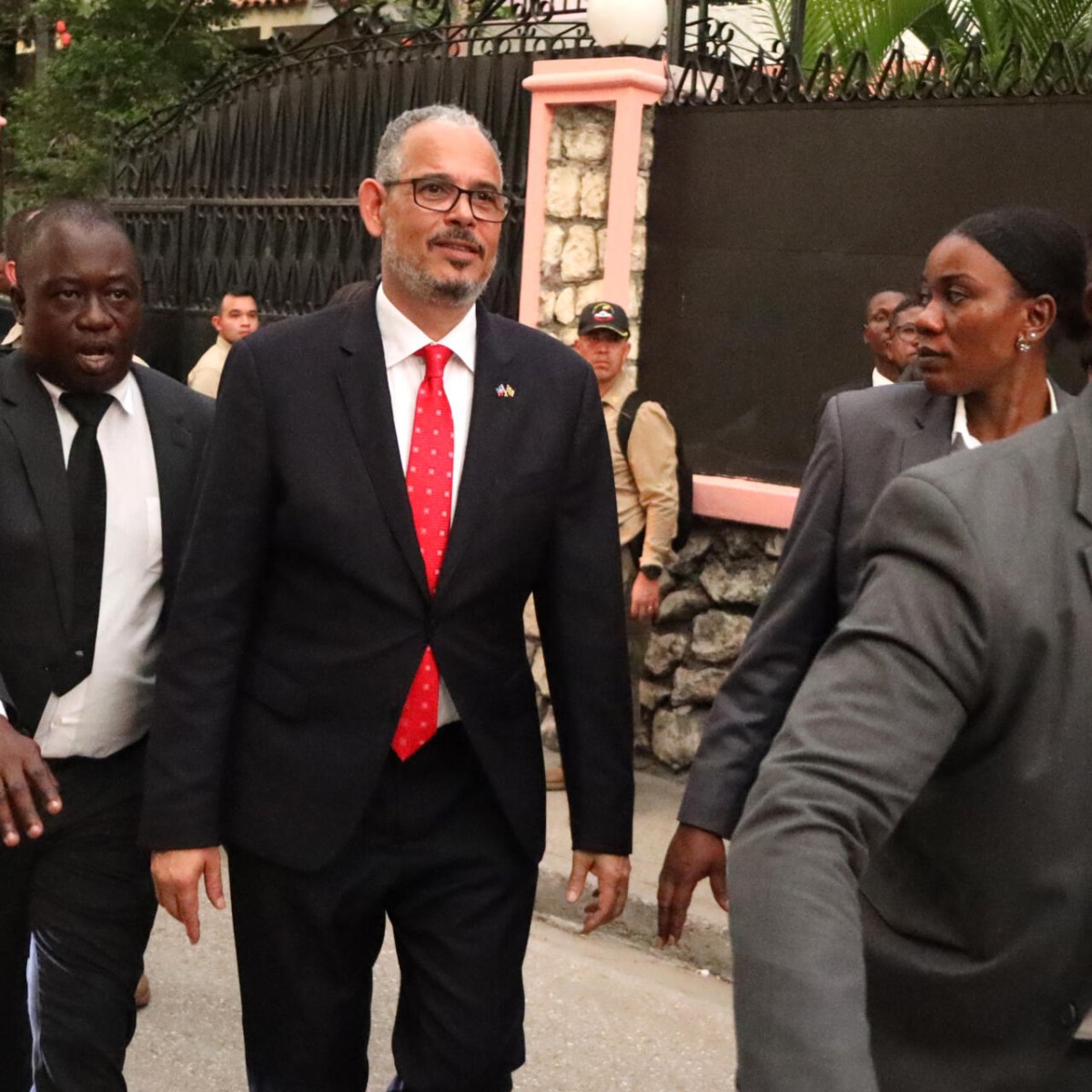 Fotografía de archivo del 18 de julio de 2025 que muestra al primer ministro haitiano, Alix Didier Fils-Aimé (c), saliendo del consulado colombiano en Puerto Príncipe (Haití). EFE/ Patrice Noel/ ARCHIVO
