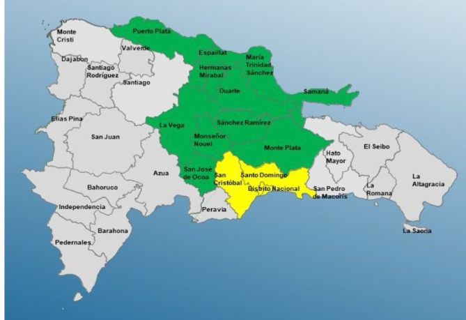En alerta amarilla se encuentran las provincias San Cristóbal, Santo Domingo y el Distrito Nacional. Mientras que en alerta verde permanecen Monseñor Nouel, Monte Plata, Samaná, Hermanas Mirabal, María Trinidad Sánchez, Duarte, San José de Ocoa, La Vega, Sánchez Ramírez, Espaillat y Puerto Plata.