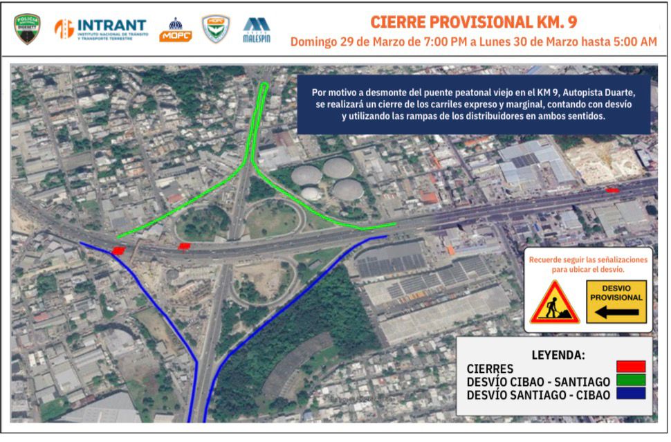 El Ministerio de Obras Públicas y Comunicaciones (MOPC) informó que este domingo, en horario nocturno, se realizará el retiro del viejo puente peatonal ubicado en el Kilómetro 9 de la autopista Duarte, lo que implicará el cierre temporal de la vía y la implementación de desvíos para garantizar la movilidad de los conductores durante los trabajos.