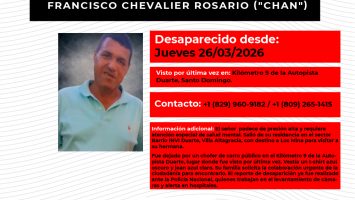 EL NUEVO DIARIO, SANTO DOMINGO.- Familiares de Francisco Chevalier Rosario, conocido como “Chan”, reportaron su desaparición tras salir desde Villa Altagracia con destino al sector Los Mina, donde se dirigía a visitar a una hermana.