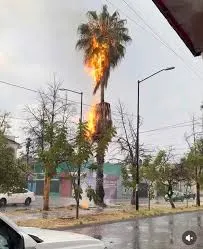 El momento del impacto fue captado en una fotografía por un ciudadano que observaba la tormenta, registrando el instante exacto en que el rayo alcanzó la palma.