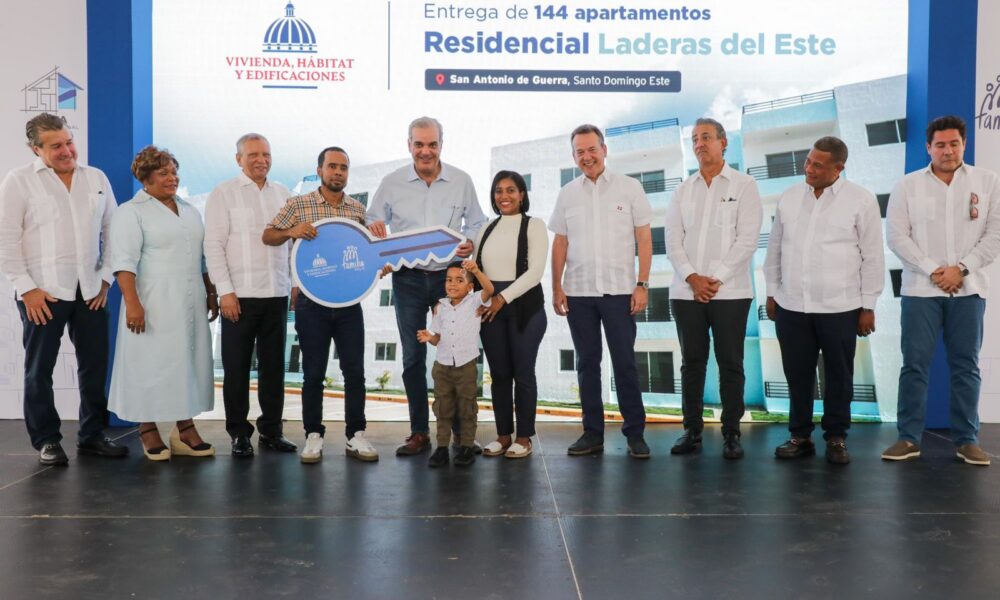 Santo Domingo Este.– El presidente Luis Abinader encabezó la entrega de 144 apartamentos del proyecto Residencial Laderas del Este, acompañado por el ministro de Vivienda, Hábitat y Edificaciones, Víctor- Ito- Bisonó, como parte de la ejecución del programa de viviendas Familia Feliz.