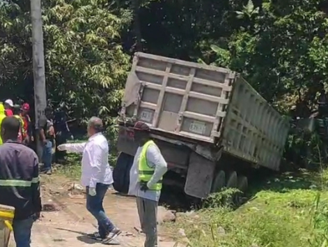 El accidente se registró alrededor de las 11:30 de la mañana, cuando un camión tipo volteo perdió el control, se volcó y se deslizó hacia el área verde de la vía, impactando a su paso una motocicleta.