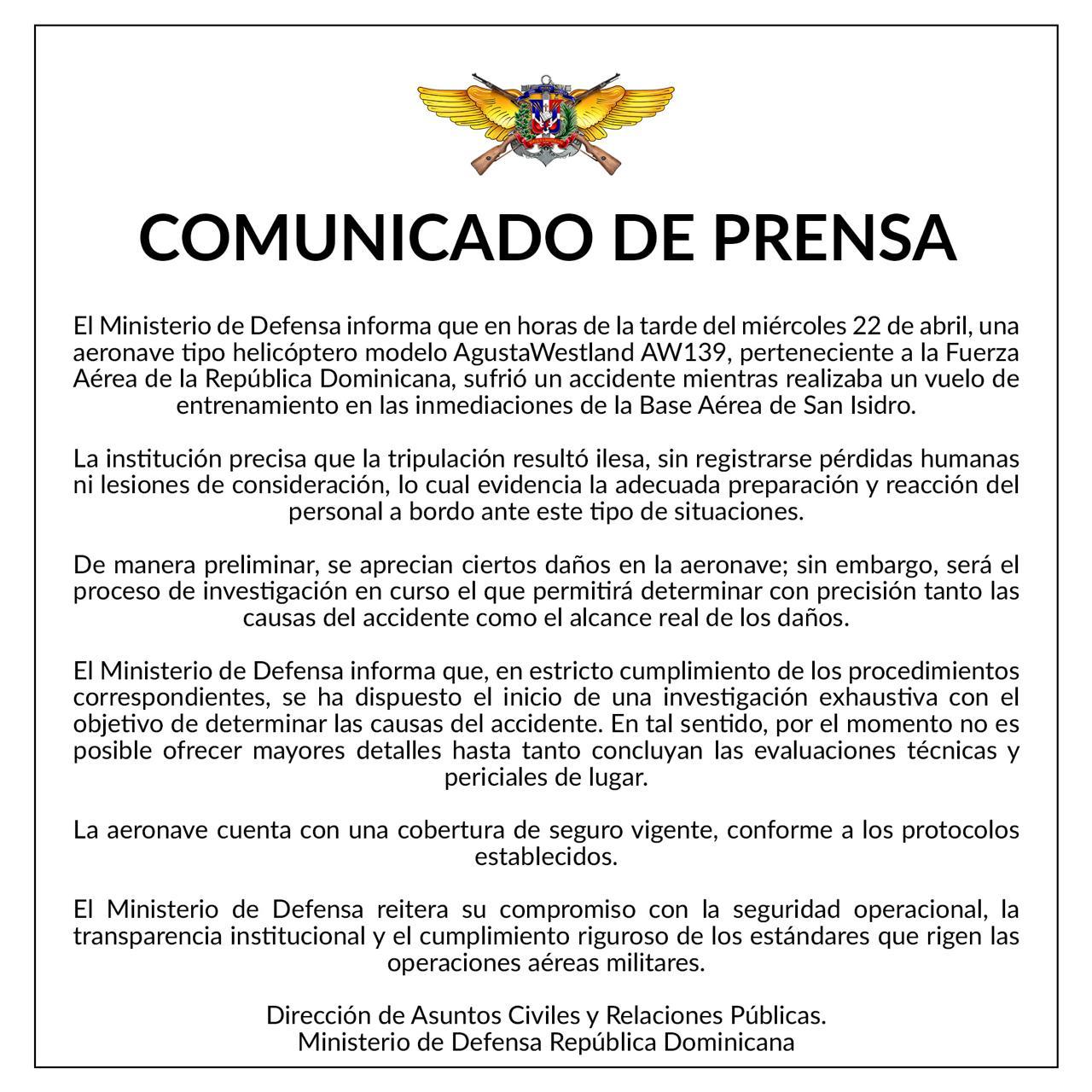 Santo Domingo.- Un helicóptero AgustaWestland AW139 de la Fuerza Aérea de la República Dominicana sufrió un accidente la tarde del miércoles mientras realizaba un vuelo de entrenamiento en las inmediaciones de la Base Aérea de San Isidro.